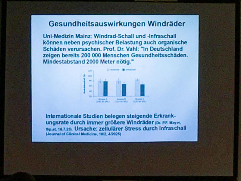 Die schädlichen Folgen des Windkraftausbaus, wie Zerschreddern von Vögeln, Insekten und Fledermäusen, Infraschall, der auch Menschen schädigt, Abrieb des Kunststoffes an den Rotorflügeln, der Boden und besonders Meere verseucht, werden der Öffentlichkeit verschwiegen.“