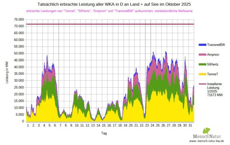 Vermutlich haben die Wissenschaftler die Rechnung ohne den Wirt (Realität) gemacht: Wie wir mit unseren eigenen Auswertungen der realen Einspeisedaten aus Windstrom im Faktencheck zeigen können, richtet sich die gesamtdeutsche Windstromerzeugung nach den Großwetterlagen. In der Grafik mit den summierten Einspeisedaten sämtlicher 4 Übertragungsnetzbetreiber ist auch der Anteil der baden-württembergischen Erzeugung in dunkelblau aufgetragen. Wie diese den Ausgleich von mehreren benötigten zig Gigawatt (im nachfolgenden Beispiel: 40.000 MW entspricht 40 GW) bewerkstelligen soll bleibt für uns unklar. Vor allen Dingen stellt sich die Frage nach der zusätzlichen Anzahl von Windindustrieanlagen, wenn die komplette Windeinspeisung aller in Deutschland aufgestellten Anlagen zusammenbricht.