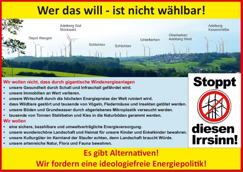 Unser Flyer zur Wahl wurde in den östlichen Schurwaldgemeinden von den Ortgruppen an alle Haushalte verteilt. Die Frontseite ist identisch. Für jede Gemeinde haben wir Visualisierungen der Planungen erstellt, um die Auswirkungen der Industrialisierung des Außenbereichs mit riesigen Windturbinen auf die Anwohnerschaft zu zeigen.