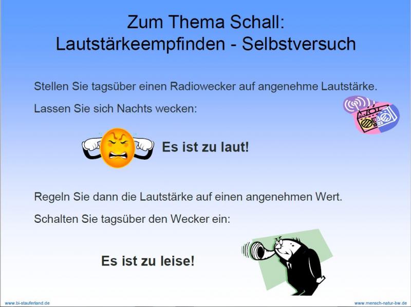 Nehmen Sie einen Radiowecker, trimmen die Lautstärke tagsüber auf einen für Sie angenehmen Wert, so wie Sie denken, geweckt werden zu wollen. Dann stellen Sie die Weckzeit, damit Sie mitten in der Nacht, so gegen 3:00 Uhr, geweckt werden. Sie werden bemerken, dass Sie aus dem Schlaf gerissen werden und die Lautstärke als unangenehm empfinden. Wenn Sie jetzt herunterregeln und den Wecker tagsüber einschalten, werden Sie wiederum erstaunen, wie leise er ist. Die Empfindung ist also stark von den Gegebenheiten abhängig und kann bis zum doppelten oder sogar dreifachen Lautstärkeempfinden variieren. Dies macht die Einschätzung des Lärms einer Windkraftanlage so problematisch.